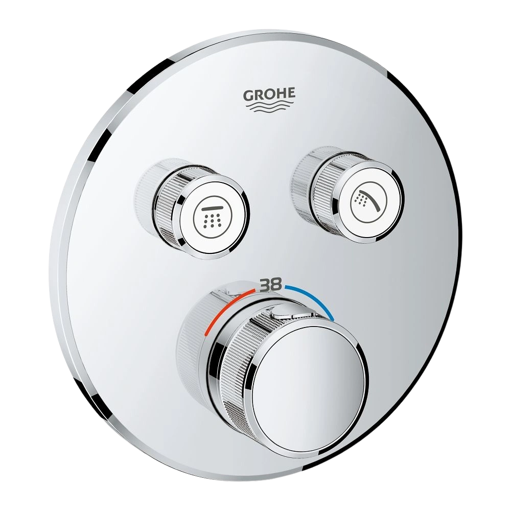 De thermostatische mengkraan is uitgerust met twee afsluiters, een ingebouwde terugstroombeveiliging en vuilopvangzeven. De verborgen bevestiging van de wandrozet met verborgen rozet en schachtafdichting kan achteraf met 6° worden uitgelijnd. Het water wordt met één druk op de knop aan- en uitgeschakeld en de hoeveelheid wordt ingesteld door te draaien. De symbolen van de knoppen zijn uitwisselbaar. De temperatuurregelaar heeft een veiligheidsblokkering bij 38°C. Door op de toets te drukken kan een temperatuurbegrenzing tot 43°C worden ingesteld. Gelijktijdig gebruik van meerdere douches is mogelijk. De kraan heeft een onderhoudsarm oppervlak en is ongevoelig voor krassen.
