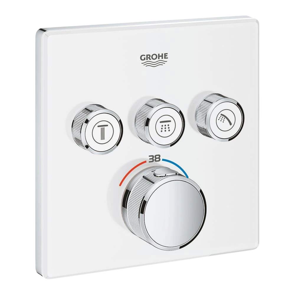 De thermostatische menger met drie afsluiters is uitgerust met terugslagkleppen en vuilopvang. De metalen muurrozet met GROHE QuickFix heeft een verborgen rozet en asafdichting. De verborgen GROHE QuickFix-bevestiging kan zijdelings 6 ° worden uitgelijnd. Het water wordt met één druk op de knop in- en uitgeschakeld en de hoeveelheid wordt ingesteld door te draaien. De symbolen van de knoppen zijn uitwisselbaar. Het is mogelijk om meerdere uitgangen tegelijkertijd te gebruiken. Met de GROHE TurboStat-cartridge wordt de gewenste temperatuur snel bereikt en constant gehouden. Het GROHE SafeStop Plus-veiligheidsslot begint bij 38°C om per ongeluk verbranden te voorkomen. Door op de toets te drukken kan een temperatuurbegrenzing tot 43°C worden ingesteld.