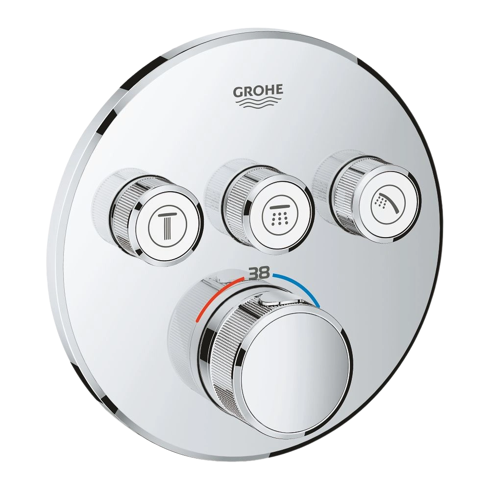 Alle productinformatieDe thermostaatkraan met drie afsluitkleppen is uitgerust met ingebouwde terugslagkleppen en vuilvangfilters. De metalen wandrozet met GROHE QuickFix heeft een verborgen rozet- en schachtdichting. De bevestiging kan achteraf 6° worden uitgelijnd en is eveneens verborgen. Het water wordt met een druk op de knop in- en uitgeschakeld en de hoeveelheid wordt ingesteld door te draaien. De symbolen op de knoppen zijn verwisselbaar. Het is ook mogelijk om meerdere verbruikers tegelijkertijd te gebruiken. De temperatuurregelaar heeft de GROHE SafeStop-veiligheidsslot, die bij 38 °C in werking treedt en zo beschermt tegen verbranding. Door op de knop van de GROHE SafeStop Plus te drukken, kan ook een temperatuurafstand tot 43 °C worden ingesteld. De GROHE TurboStat compacte cartridge zorgt ervoor dat de gewenste temperatuur snel wordt bereikt en constant blijft. Het GROHE StarLight oppervlak is onderhoudsvriendelijk en krasbestendig.