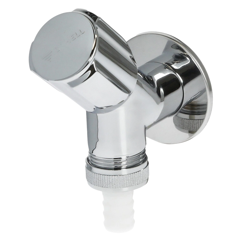 Haakse apparaatkraan voor het aansluiten van de waterleiding op een wasmachine, wastafel, gootsteen of toilet. De watertoevoer wordt gestopt door aan de driehoekige greep te draaien. De kraan met hoekzitting is voorzien van een terugslagklep.