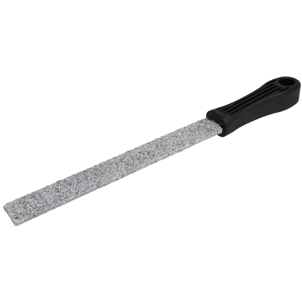 Vlakke tegelvijl met carbidecoating, grove korrel en handig kunststof handvat.