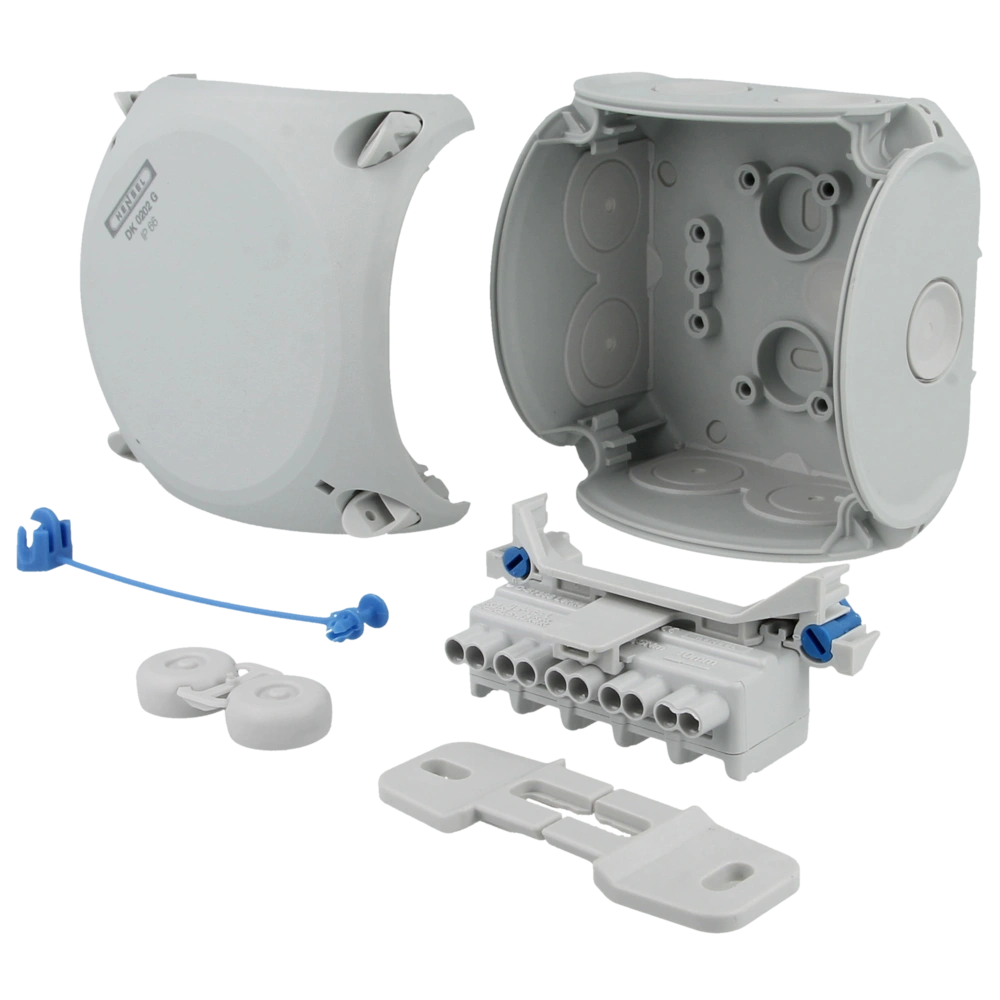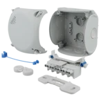 Kabelaansluitdoos voor opbouwmontage in gebouwen of beschermde buitenruimtes. Bovendien biedt het elastische afdichtingsmembranen die kunnen worden verwijderd voor kabelinvoer. Voor openbare ruimtes bestaat de mogelijkheid om deze aansluitdoos te verzegelen.