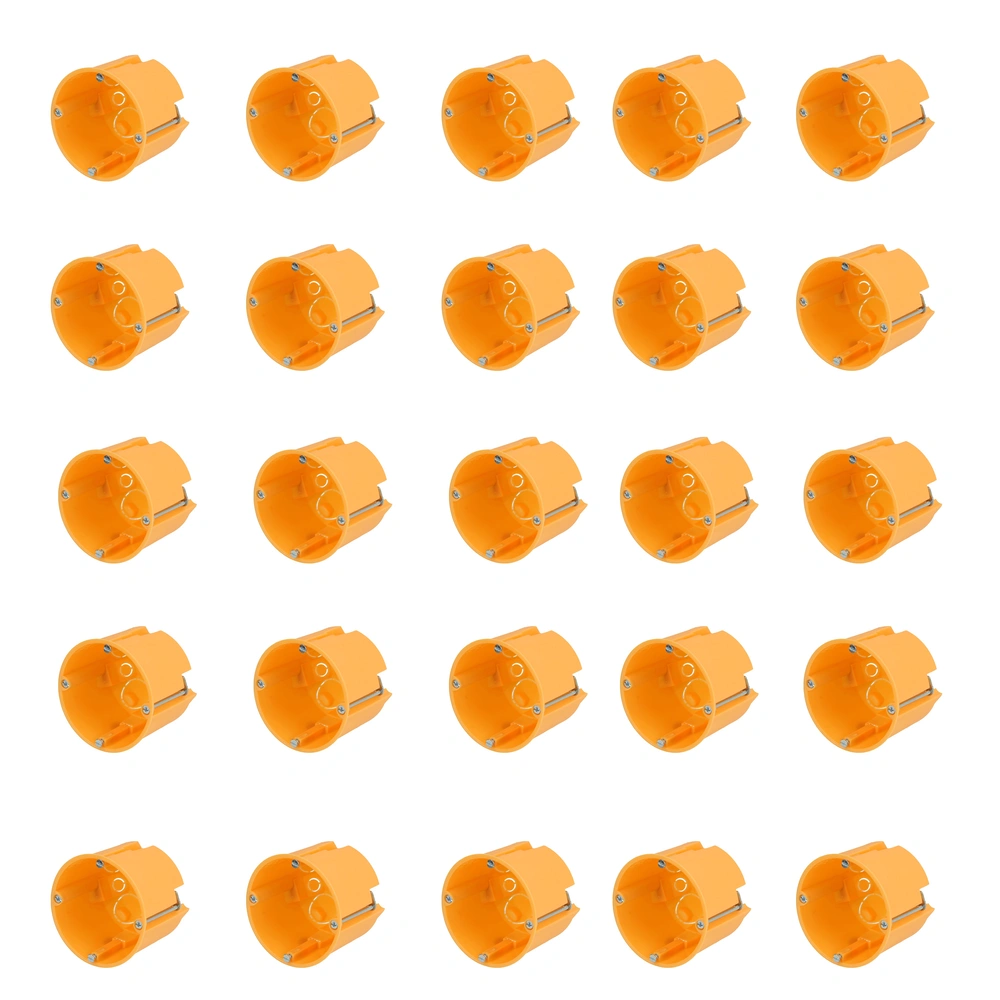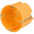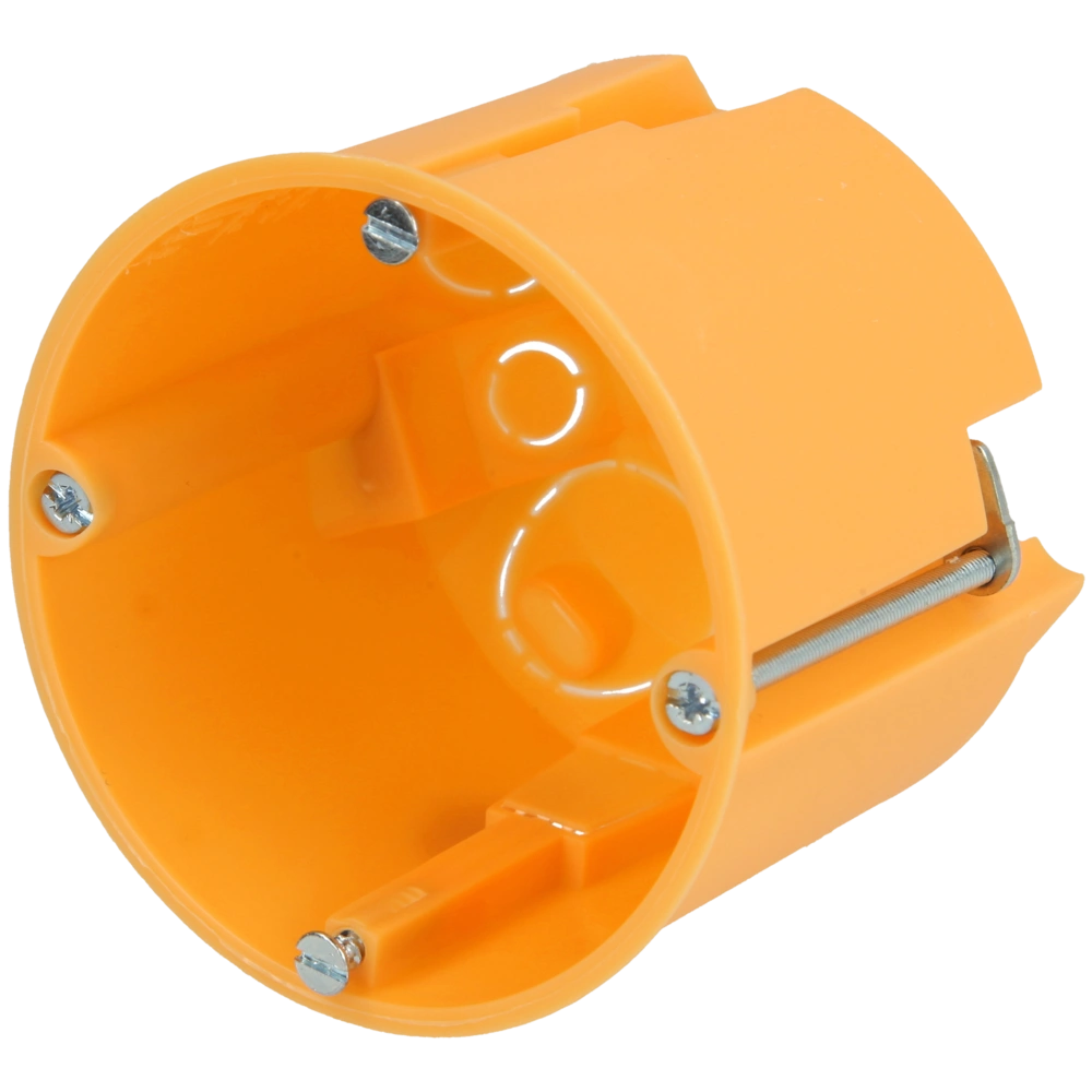 Verbindingsdoos met metalen klauwen en voorgemonteerde apparaatschroeven voor installatie in gipsplaat en spouwmuren. De verbindingsdoos heeft uitsparingen voor leidingen en buizen.