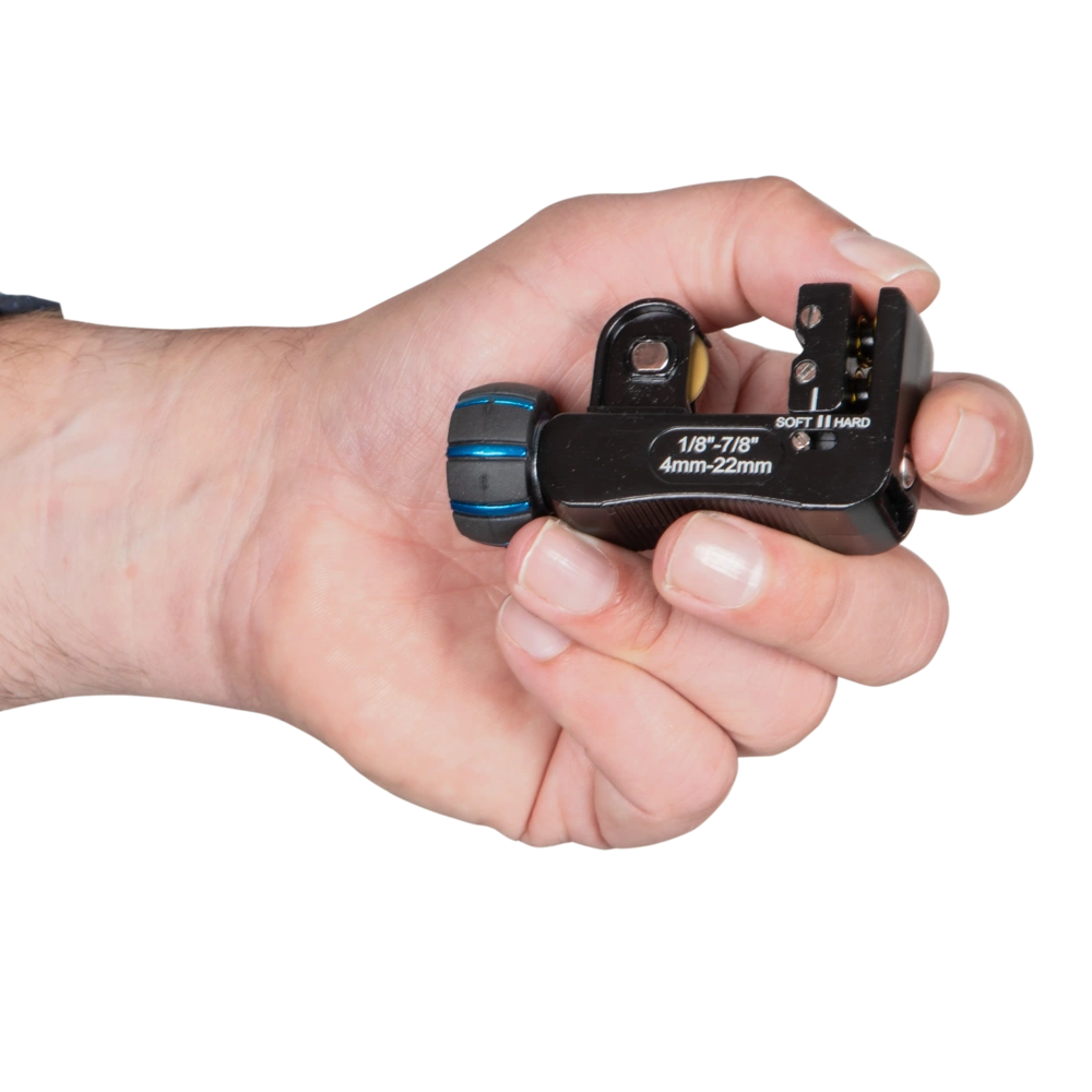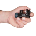 Precisie pijpsnijder met titanium gecoate snijwiel. Door de verende tegenrollen blijft de druk van het snijwiel op de buis altijd constant, waardoor een zuivere snede ontstaat en het mes niet hoeft te worden aangedraaid...