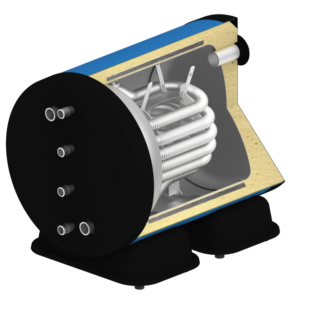 Het ontwerp van deze vaten verschilt fundamenteel van conventionele warmwaterboilers met een groot volume. Een ingebouwde geribbelde RVS buis scheidt het drinkwater van het verwarmingswater en dient ook als een krachtige warmtewisselaar. Dit combineert de voordelen van een buffervat met die van een doorstroomverwarmer.