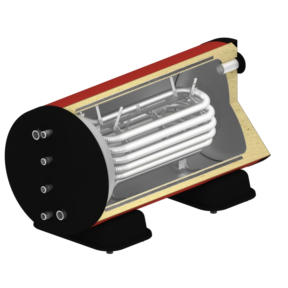 De boiler heeft 1 stalen wisselaar voor glyco en 1 RVS wisselaar voor het tapwater.