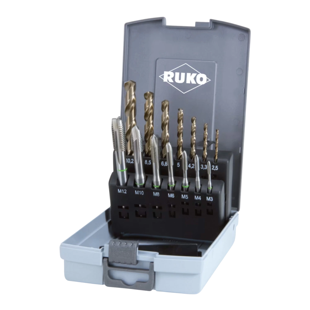 Machinetapset inclusief boren voor het tappen in staal, messing, aluminium, brons, kunststof en gietijzer. De boren met kobaltgehalte, die zijn afgestemd op de tap, maken indruk door hun hoge hittebestendigheid en veerkracht.