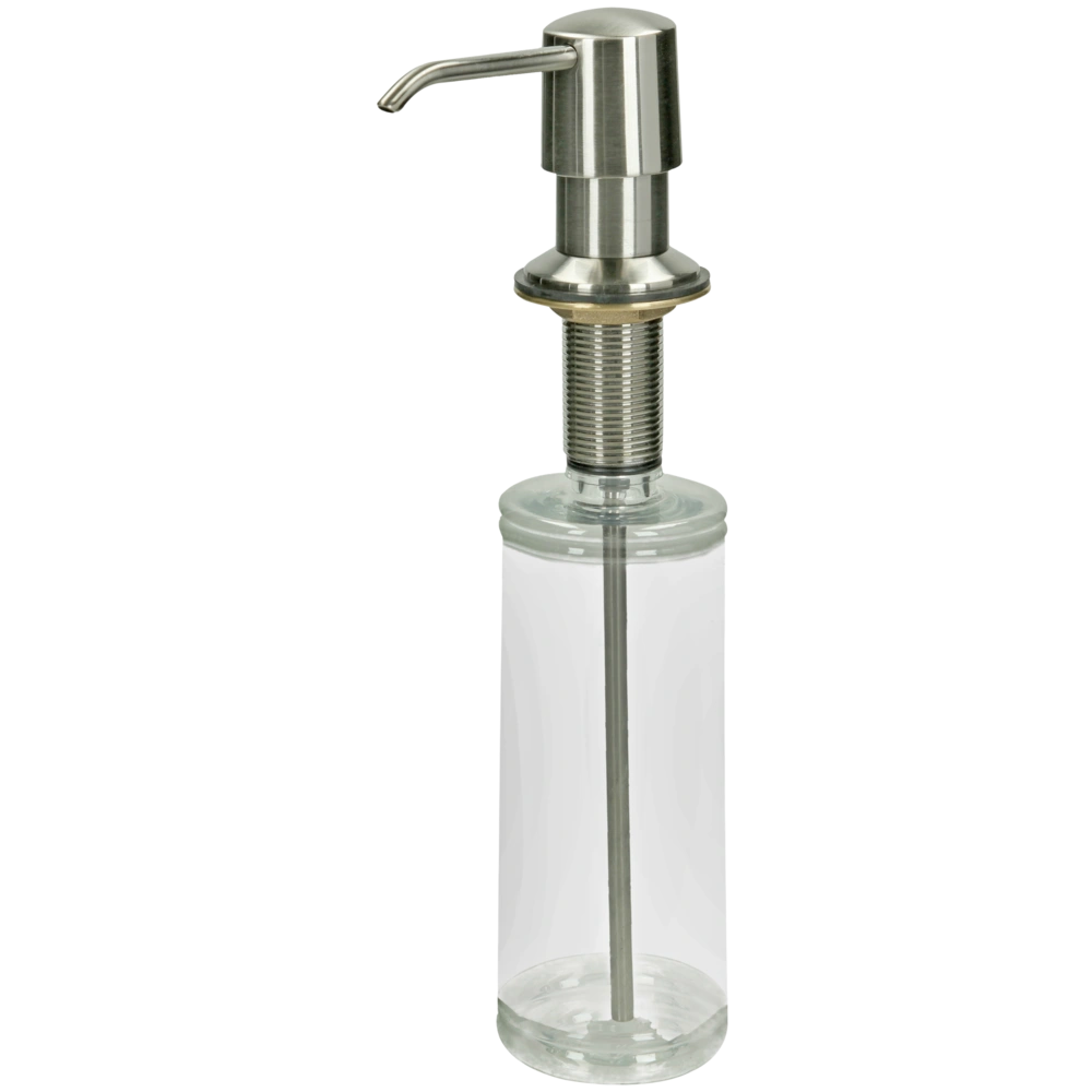 Zeepdispenser met hendel van verchroomd messing in RVS-look voor inbouw in wastafels en gootstenen. Het kunststof reservoir kan eenvoudig van bovenaf worden gevuld door de kop los te draaien.