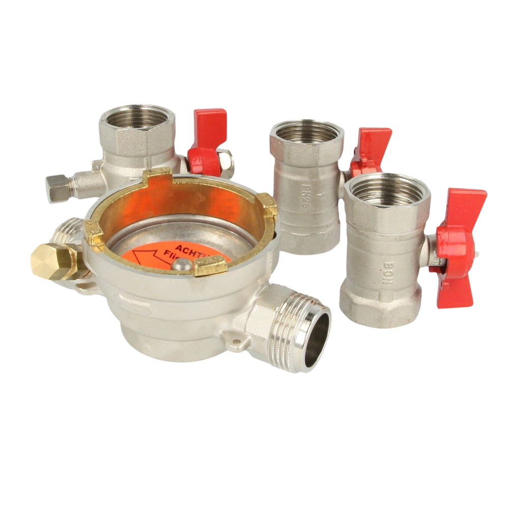 De Allmess installatiekit EAT is uitgerust met een geïntegreerde dompelhuls voor terugstromingssensoren, een messing stromingsprofielstuk met dompelhuls voor stromingssensoren en een messing blindflens...