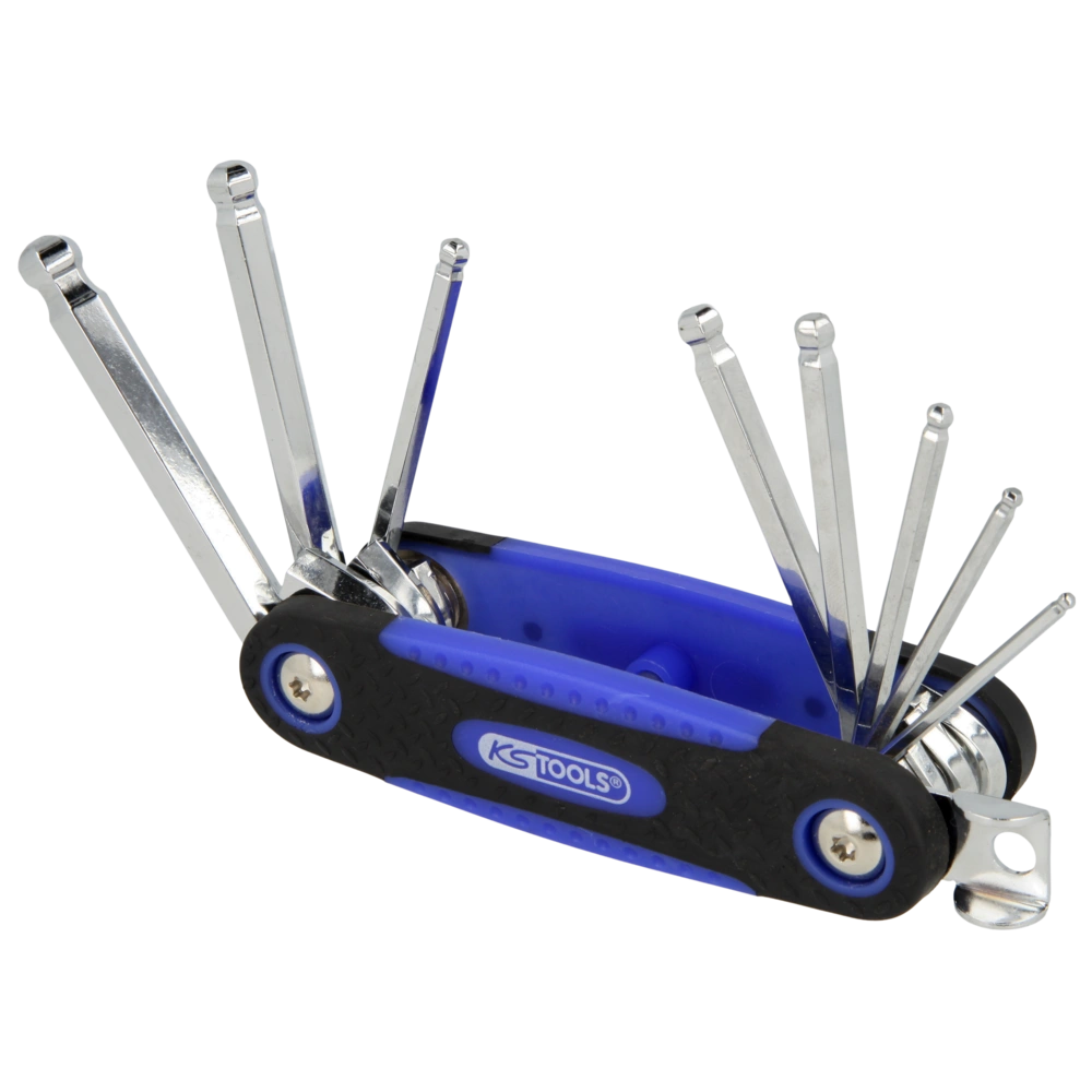 De inbussleutelset is gemaakt van continu gehard, hoogglans verchroomd speciaal staal en biedt alle gebruikelijke inbussleutels in een stevige inklapbare houder.