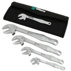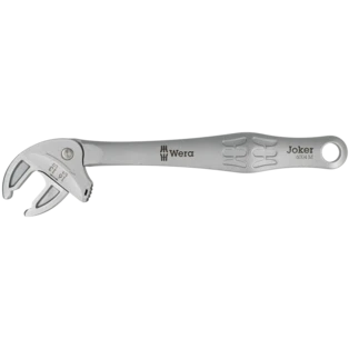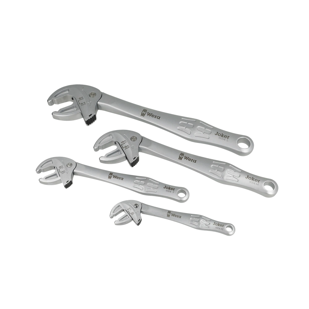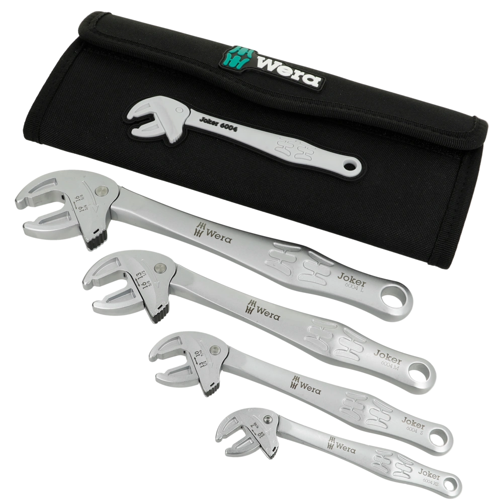 De set van vier verstelbare en zelfinstellende steeksleutels Joker dekt alle metrische en Engelse afmetingen in het toepassingsbereik van 7 tot 19 mm of 1/4" tot 3/4". De gewenste maat past zichzelf continu en automatisch aan wanneer deze op de zeskantmoer of -schroef wordt aangebracht. Het geïntegreerde hefboommechanisme klemt de zeskantschroef of moer stevig tussen de bekken. Dit voorkomt dat de zeshoek wegglijdt en beschadigd raakt. De ratelfunctie in de bek zorgt voor snel en continu schroeven zonder verwijderen. Dankzij de hoekbreedte-prisma's is een achterwaartse draaihoek van slechts 30° mogelijk, wat ook het werk in krappe ruimtes ondersteunt. De set wordt geleverd in een praktische opvouwbare tas.