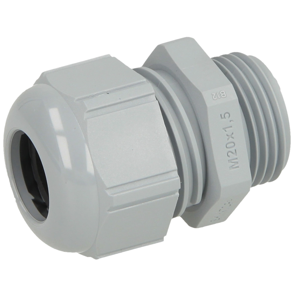 Kabelwartel van polyamide met geïntegreerde trekontlasting en metrische aansluitschroefdraad. Het materiaal is vlamvertragend en halogeenvrij.
