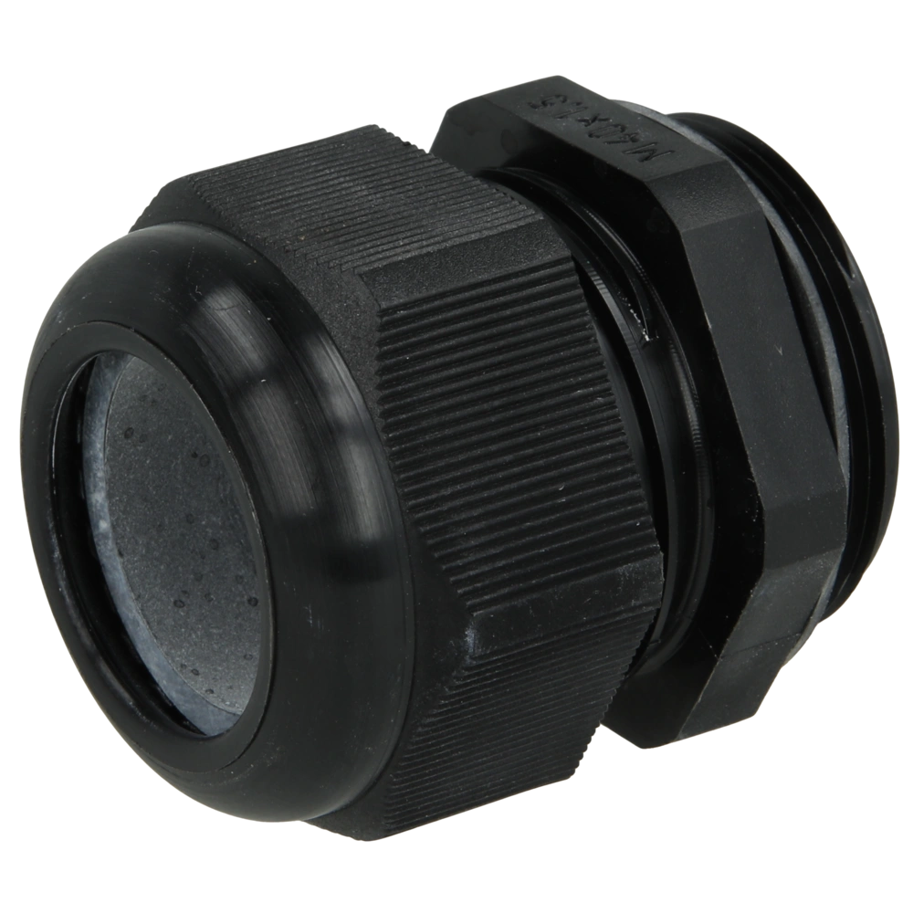 Kabelwartel van polyamide met geïntegreerde trekontlasting en metrische aansluitschroefdraad. Het materiaal is vlamvertragend en halogeenvrij.