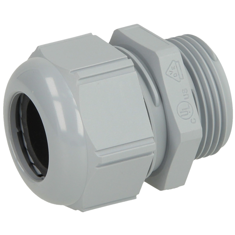 Kabelwartel van polyamide met geïntegreerde trekontlasting en metrische aansluitschroefdraad. Het materiaal is vlamvertragend en halogeenvrij.