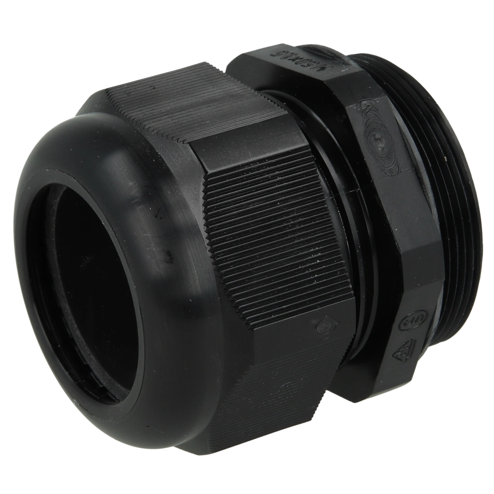 Kabelwartel van polyamide met geïntegreerde trekontlasting en metrische aansluitschroefdraad. Het materiaal is vlamvertragend en halogeenvrij.