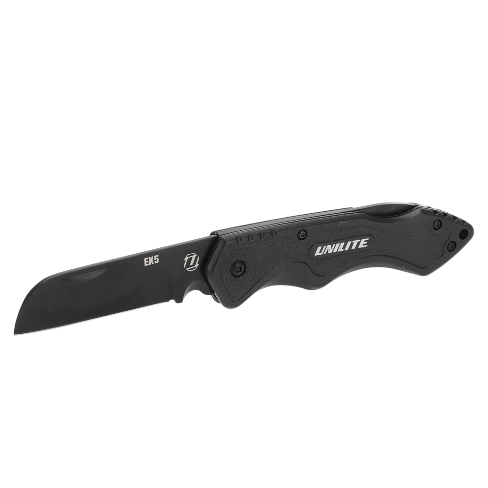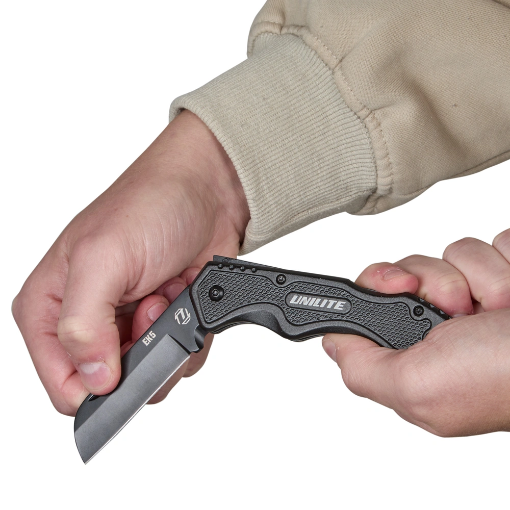 Het mes heeft een knopgreep voor gemakkelijk openen en een vergrendelingsmechanisme voor veilig inklappen. Het robuuste aluminium handvat ligt prettig in de hand en er kan een draagriem aan het handvat worden bevestigd voor eenvoudig transport.