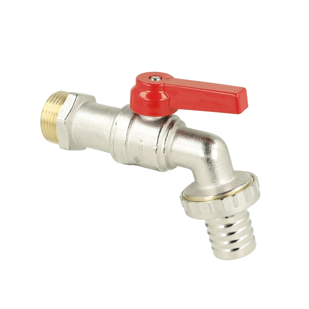 De kogelkraan is gemaakt van vernikkeld messing en is voorzien van een messing slangaansluiting en een rode stalen hendel.
