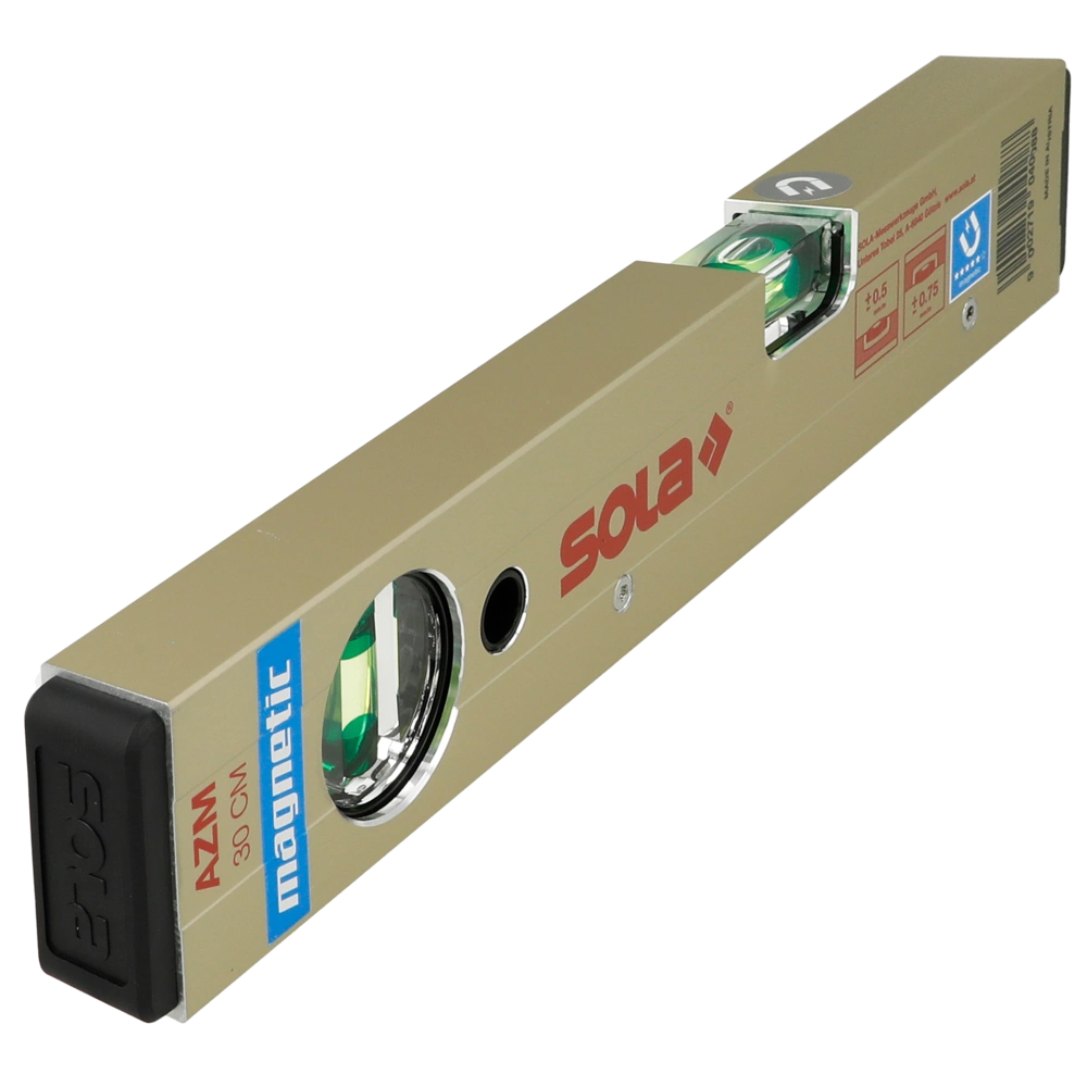 De SOLA AZM 3 waterpas is uitgerust met een robuust profiel van zeer sterke aluminiumlegering voor een lange levensduur en vier ferrietpoolmagneten. De gepatenteerde SOLA-FOCUS-libellen zorgen voor een betere en meer accurate meting. De onbreekbare blokflacons met een vergrootlens (+60 %) en de SOLA lichtgevende coating maken het werk eenvoudiger. De eindkappen bieden optimale bescherming tegen beschadiging. De fabrikant geeft 30 jaar garantie op lekdichtheid op de flesjes van acrylglas.