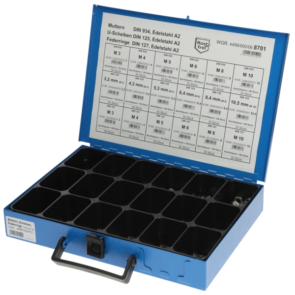 Assortimentsbox voor orde en overzicht van kleine onderdelen zoals schroeven, moeren en ringen. Dankzij het stevige ontwerp met handvat is de plaatstalen box geschikt voor veilig transport en het snel vinden van het juiste onderdeel onderweg.