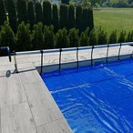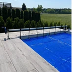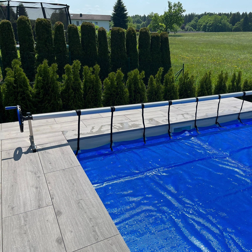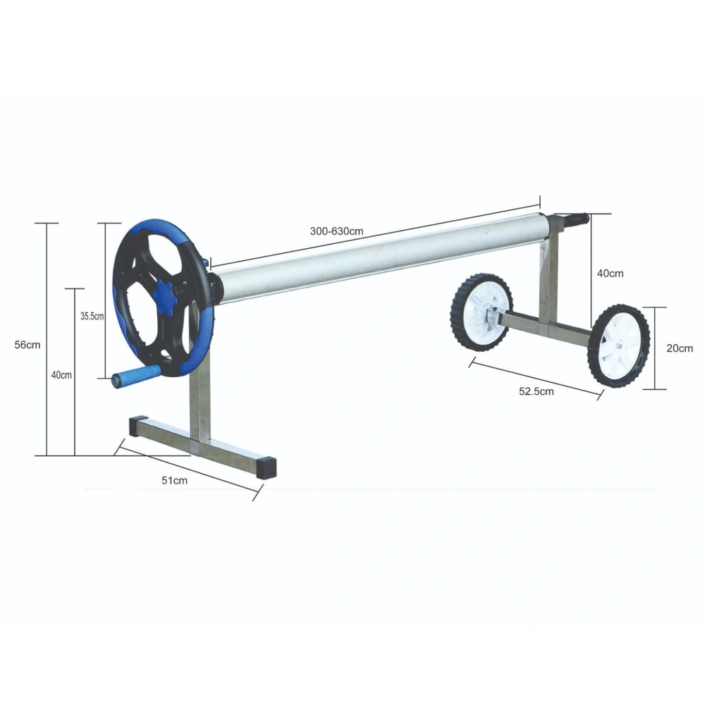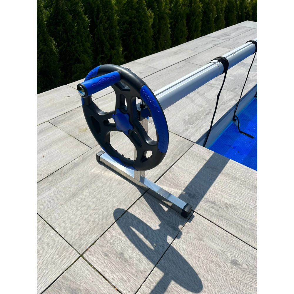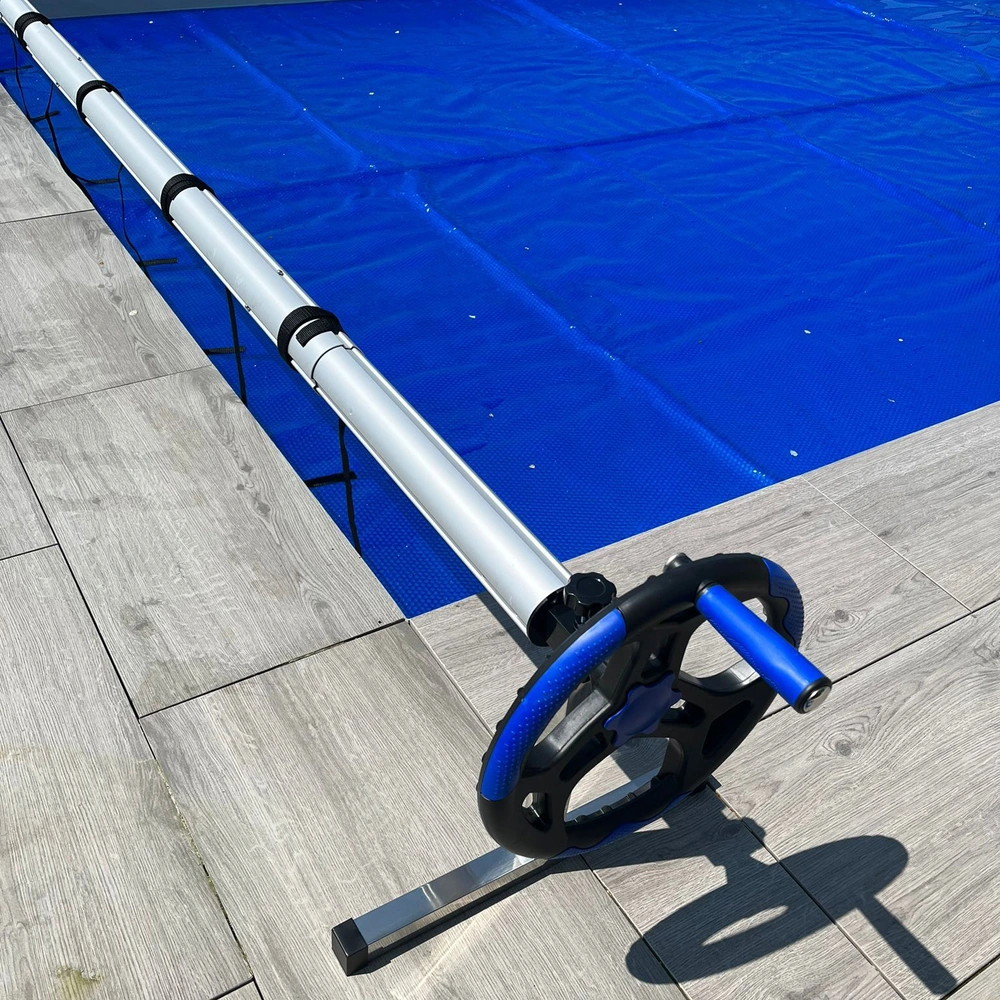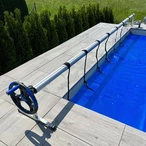 Alle productinformatie LeveringMobiel oprolapparaat met handslinger voor het gemakkelijk afrollen en oprollen van ronde of vierkante afdekzeilen en Solarzeilen. Het systeem bestaat uit een 5-delige aluminium buis, in lengte verstelbaar van 3 tot 6,3 m, een RVS standaard en twee wielen waarmee het apparaat gemakkelijk kan worden opgerold. Met de riemen kan het zwembad- of Solarzeil stevig worden vastgezet.