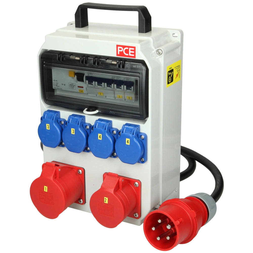 Mobiele compacte verdeler met draagbeugel in robuuste uitvoering als ideale oplossing voor bouwplaatsen of werkplaatsen. De automatische stroomonderbrekers zijn klaar voor aansluiting op klemmen achter een transparante beschermklep. Het compacte ontwerp bespaart ruimte en is gemakkelijk op te bergen.