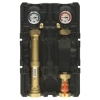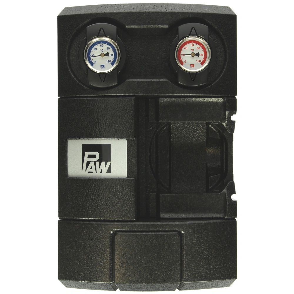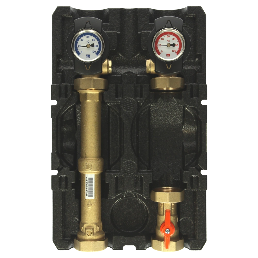 De aansluitingen van het verwarmingscircuit hebben een binnendraad van 1". De grote kogelkraanhandgrepen vergemakkelijken de bediening en geven duidelijk de gesloten stand aan. Het modulaire verwarmingscircuit is uitgerust met functiegeoptimaliseerde designisolatie van duurzaam elastisch EPP, dat de fittingen 100% isoleert. Het systeem heeft ook een ventilatiekanaal voor het koelen van de pompen. Vrije toegang tot de pompkop is gegarandeerd door eenvoudig het deksel eraf te trekken. Het verwarmingscircuit heeft zwaartekrachtremmen (instelbaar, 200 mmWs, veerbelast) in de retourleiding om lawaai te voorkomen bij gebruik van elektronisch geregelde pompen. De pomp kan daarom ook horizontaal of boven het hoofd worden geïnstalleerd. De aanvoerleiding is standaard rechts voorgemonteerd, maar de aanvoer- en retourleidingen kunnen worden verwisseld. Alle watervoerende onderdelen van het verwarmingscircuit zijn gemaakt van messing. Het modulaire verwarmingscircuit wordt in elkaar geschroefd met een platte afdichting. De volledig metalen thermometer als handvat in de kogelkraan is afneembaar en heeft een geïntegreerde thermovoering. De gebruikte pomp kan volledig worden afgesloten, zodat het modulaire verwarmingscircuit tijdens het onderhoud niet hoeft te worden afgetapt.