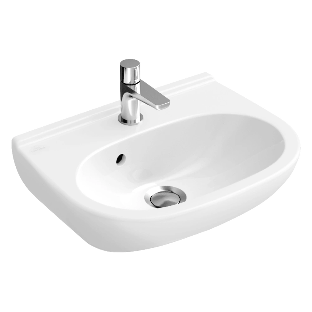 Compacte wastafel voor wandmontage. De diepe waskom beschermt veilig tegen spatten en het onderhoudsvriendelijke oppervlak is kras- en stootvast. De wastafel met overloop en voorgestansd kraangat is ook geschikt voor 3-gats kranen.