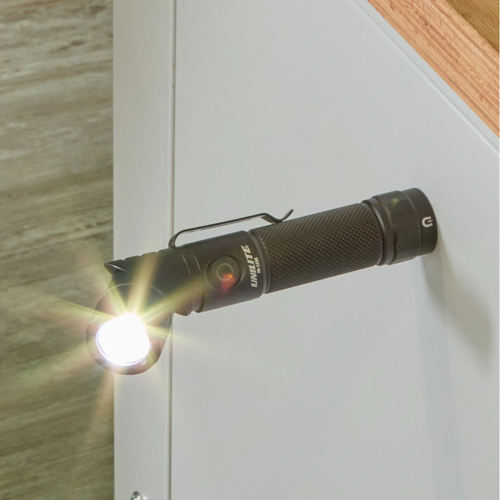 Krachtige zaklamp met 90° draaibare kop en LED's van hoge kwaliteit die kunnen worden ingesteld op 3 helderheidsniveaus. De lamp, die altijd bij de hand is met de praktische zakclip, heeft een robuuste gegoten aluminium behuizing en is stof- en waterdicht en valbestendig vanaf een hoogte van 2 meter. Voor handsfree werken kan hij met de magnetische voet worden bevestigd aan metalen oppervlakken. De zaklamp kan snel worden opgeladen met de meegeleverde USB-C oplaadkabel en kan ook op batterijen werken.
