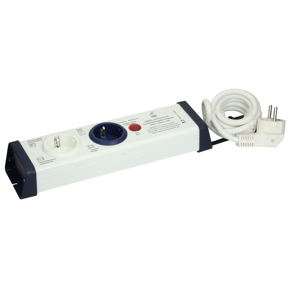 De stekkerdoos met overbelastingsbeveiliging is geschikt voor het aansluiten van twee apparaten met een hoog energieverbruik, zoals wasmachine, droger, vaatwasser of onderbouw-doorstroomverwarmer.