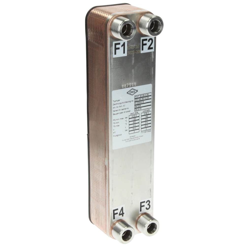Alle productinformatieDe gesoldeerde platenwarmtewisselaar bestaat uit geprofileerde roestvrijstalen platen met reliëf, die 180° ten opzichte van elkaar zijn gedraaid. De thermodynamisch geoptimaliseerde golving creëert stromingskanalen met een zeer efficiënte warmteoverdracht bij lage drukverliezen. Een maximale warmteoverdracht wordt bereikt door het feit dat de warme en koude media standaard in tegenstroom door de warmtewisselaar worden geleid.