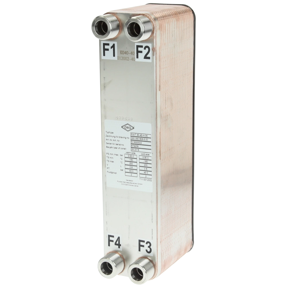 Alle productinformatieDe gesoldeerde platenwarmtewisselaar bestaat uit geprofileerde roestvrijstalen platen met reliëf, die 180° ten opzichte van elkaar zijn gedraaid. De thermodynamisch geoptimaliseerde golving creëert stromingskanalen met een zeer efficiënte warmteoverdracht bij lage drukverliezen. Een maximale warmteoverdracht wordt bereikt door het feit dat de warme en koude media standaard in tegenstroom door de warmtewisselaar worden geleid.