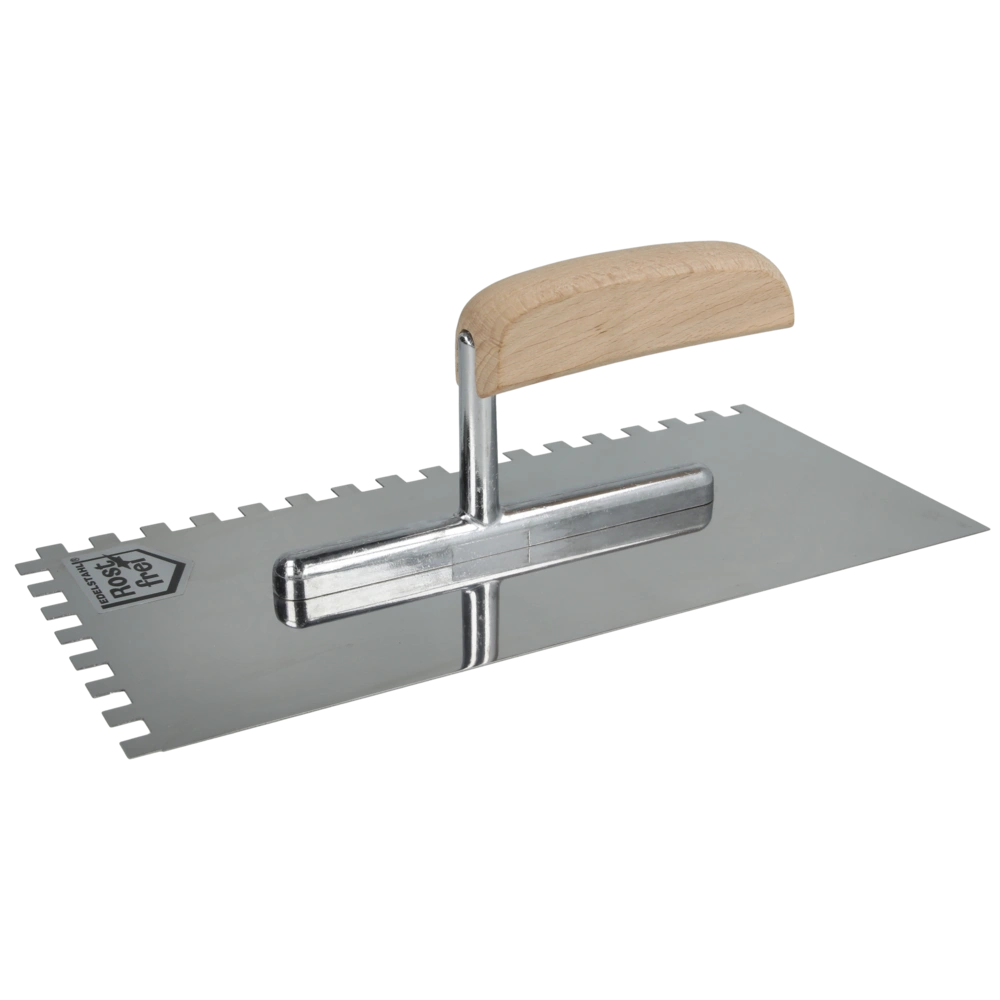 De getande troffel is een belangrijk werkinstrument voor metselaars, tegelzetters en loodgieters. Afhankelijk van het ontwerp kan tegellijm, pleister of plamuur op de vloer of op de wanden worden aangebracht. De troffel met zijn handige houten handvat is ook geschikt voor het opvullen of gladstrijken van oneffenheden, scheuren, voegen en gaten.