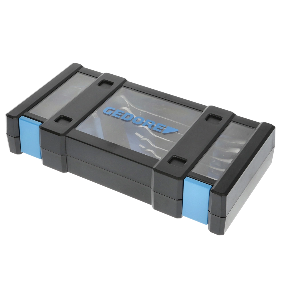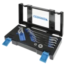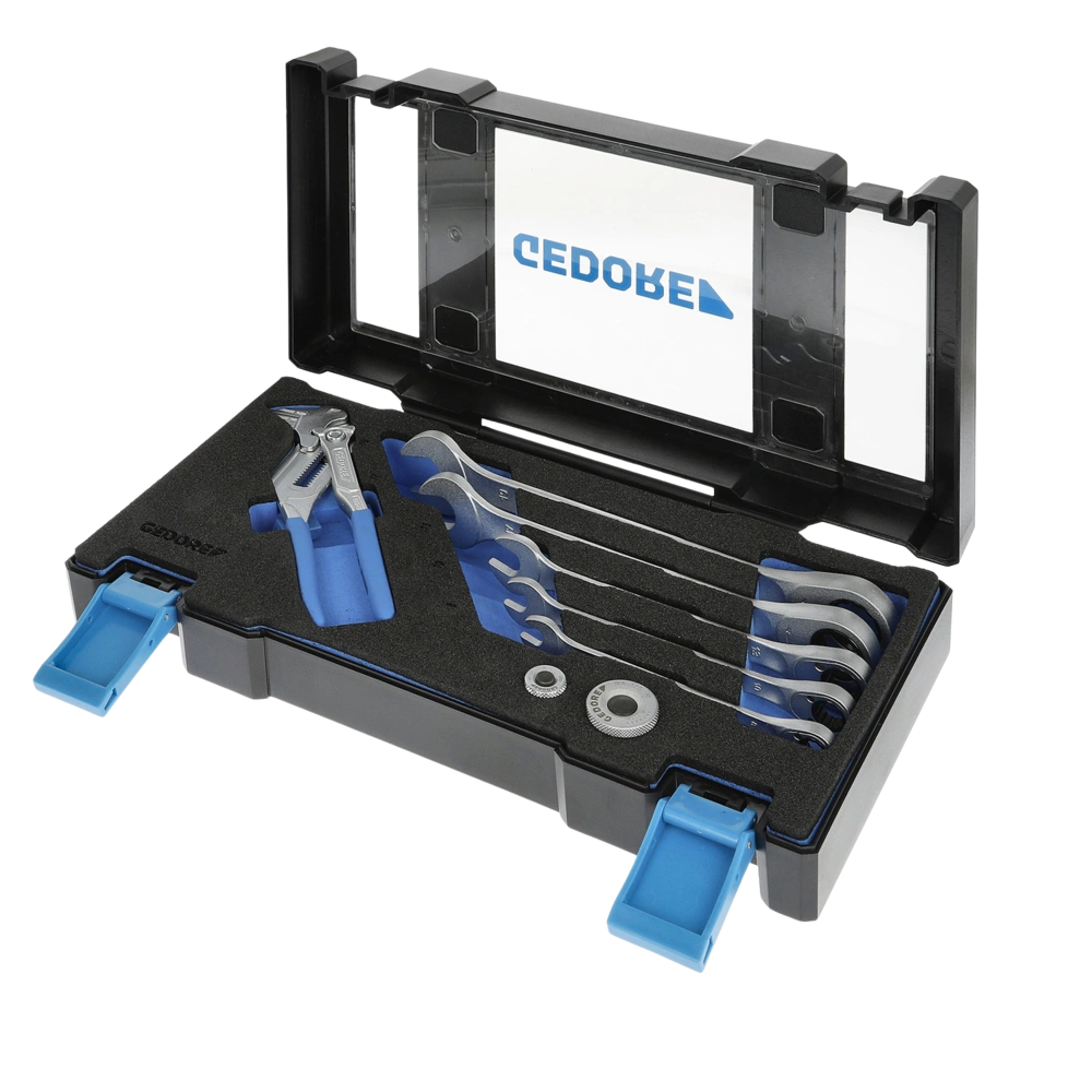 Steeksleutel met ringratel in verschillende maten en steeksleutel in één set. Een aandrijfadapter voor 1/4"- of 1/2"-wisselstukken en opsteekbare beschermbekken voor gevoelige oppervlakken zorgen voor een breed scala aan toepassingsmogelijkheden. Dankzij het UD-profiel is een behoedzame krachtoverbrenging mogelijk.