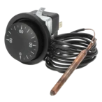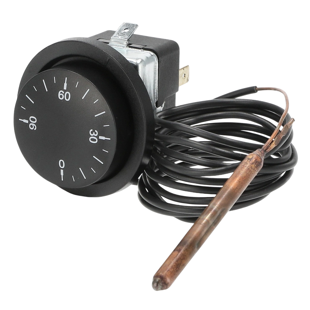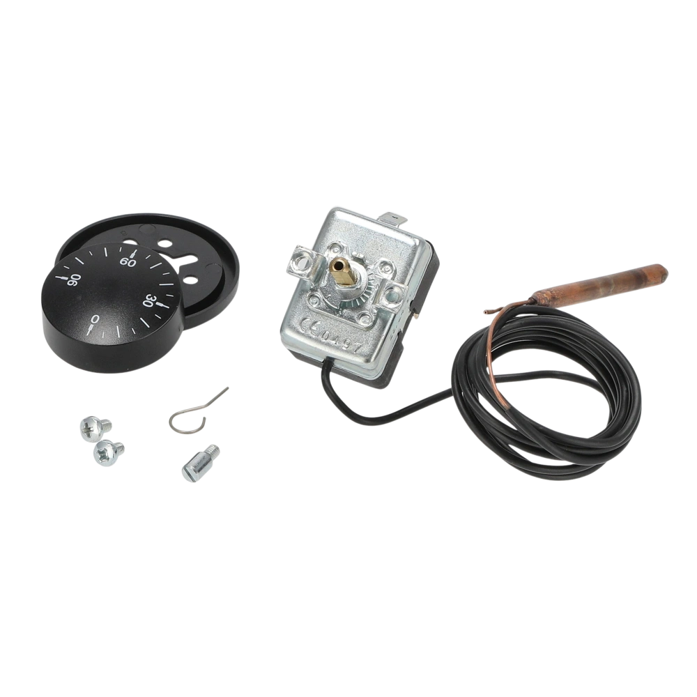 Regelthermostaat met frame, draaiknop en schroeven. De thermostaat biedt veel toepassingsmogelijkheden en wordt gebruikt om de temperatuur van boilersystemen te regelen.