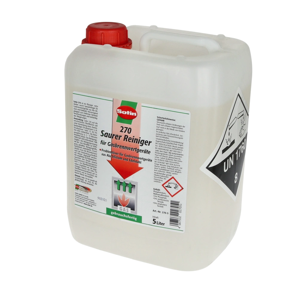 Ketelreiniger voor gasgestookte condensatieketels, warmtewisselaars en geisers van aluminium-silicium en roestvrij staal. De zeer zure, zoutzuurvrije, gebruiksklare oplossing voor sproeien of dompelen verwijdert de hardnekkigste vervuilingen zoals roet, sulfaatafzettingen en andere niet-brandbare afzettingen. Te gebruiken als basisreiniger en voor jaarlijks onderhoud.