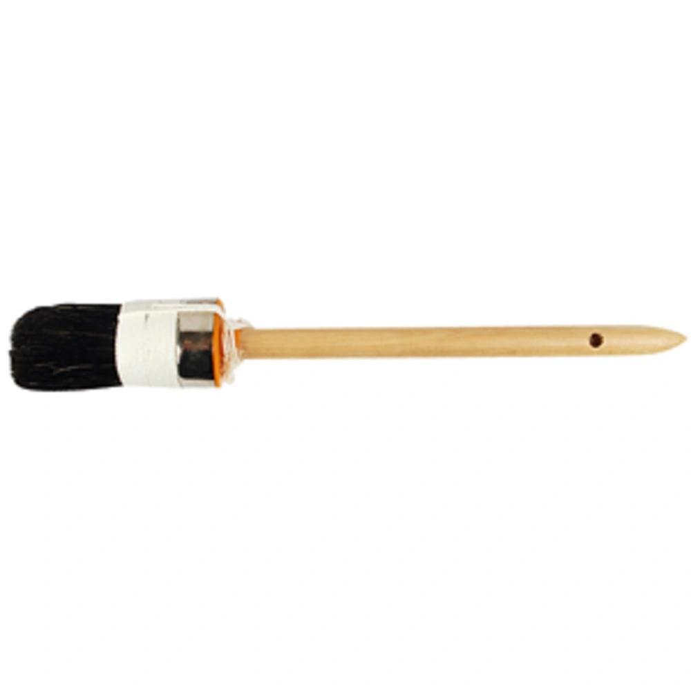 Ringkwast voor schilderwerk gemaakt van een hoogwaardig geborsteld borstelmengsel, een dubbeldraads bindband, een vernikkelde ring en een hardhouten handvat.