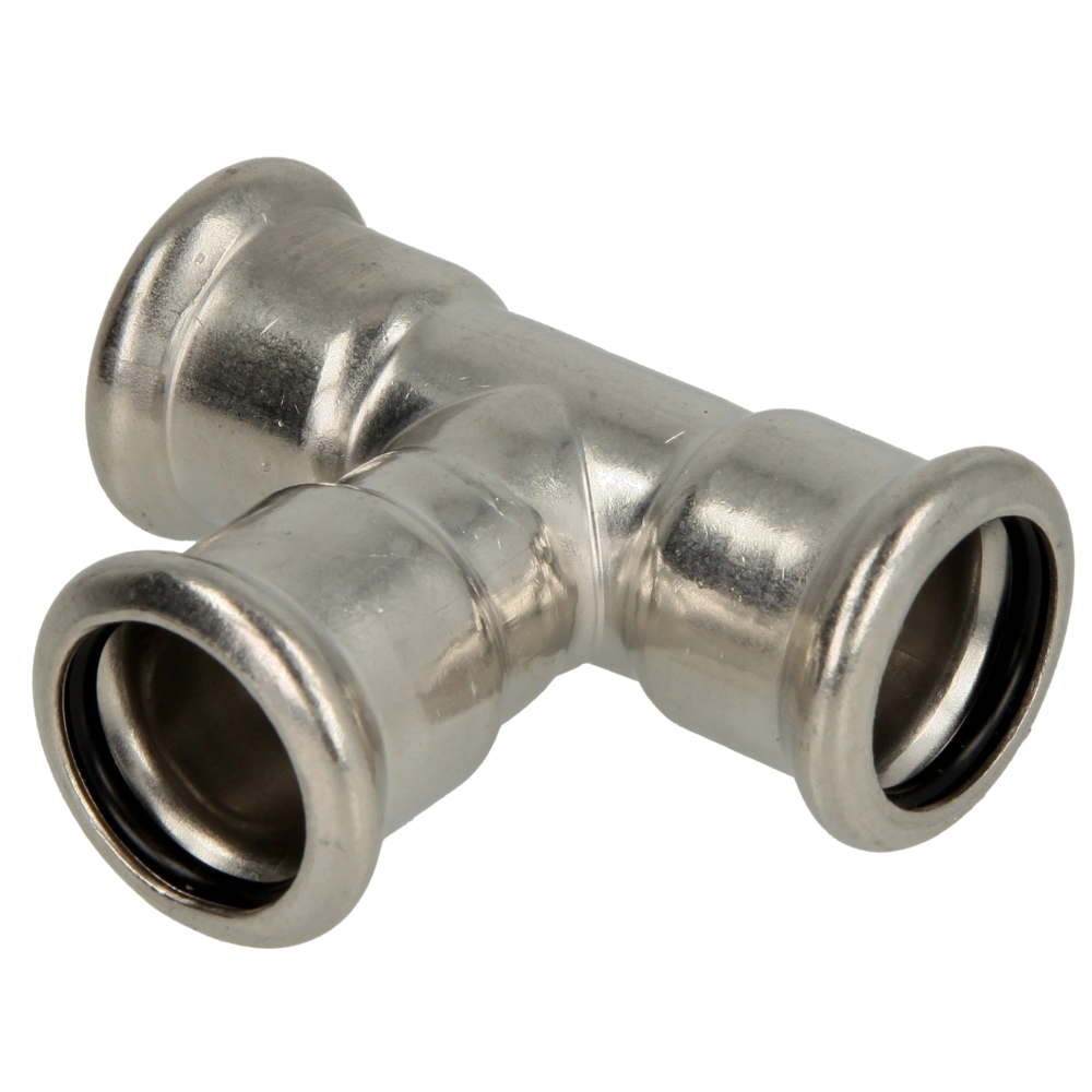 RVS persfitting voor drinkwaterinstallatie en verwarmings-, koel- en solarinstallaties voor persbekken met contour M. Ook toepasbaar in olievrije en droge persluchtinstallaties. De fittingen zijn bij levering voorzien van een hittestabiliserende en heetwaterbestendige O-ring van EPDM.