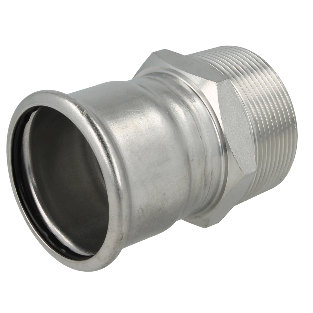 RVS persfitting voor drinkwaterinstallatie en verwarmings-, koel- en solarinstallaties voor persbekken met contour M. Ook toepasbaar in olievrije en droge persluchtinstallaties. De fittingen zijn bij levering voorzien van een hittestabiliserende en heetwaterbestendige O-ring van EPDM.