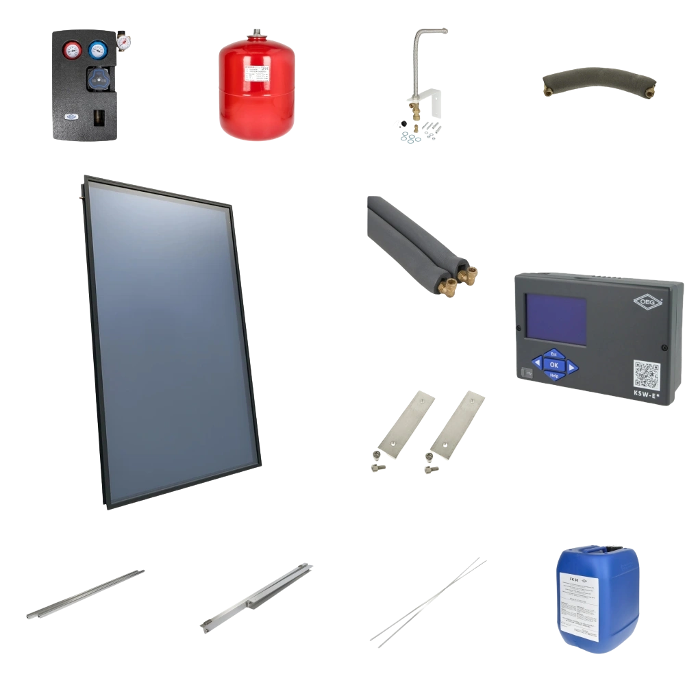 Compleet Solarpakket met 4plus thermische collectoren met gepatenteerde warmtegeleidingstechnologie, montagesysteem en uitgebreide accessoires voor een snelle en veilige installatie. De geteste afzonderlijke componenten van hoge kwaliteit garanderen een lange levensduur en betrouwbaarheid van het systeem.