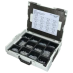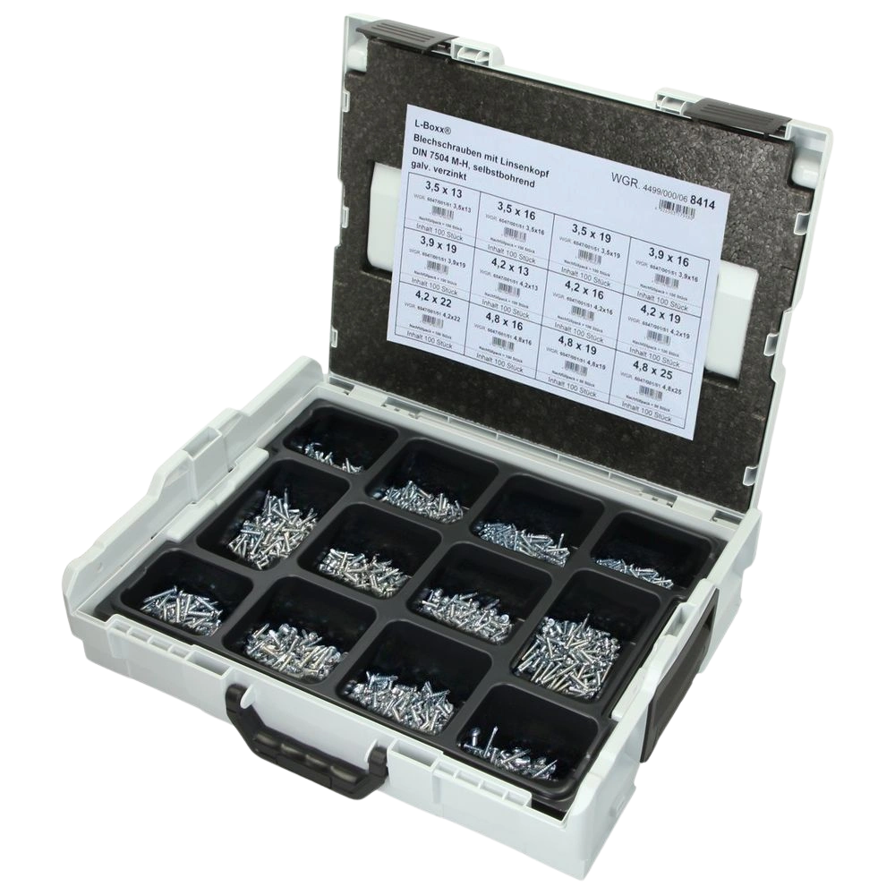 Alle productinformatie LeveringDe robuuste Sortimo L-BOXX® is 12 keer uitgerust met 1200 zelftappende schroeven en een gelamineerd montageplan. De schroeven hebben een kop, zijn zelfborend en verzinkt. De doos is stapelbaar dankzij het kliksysteem.