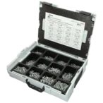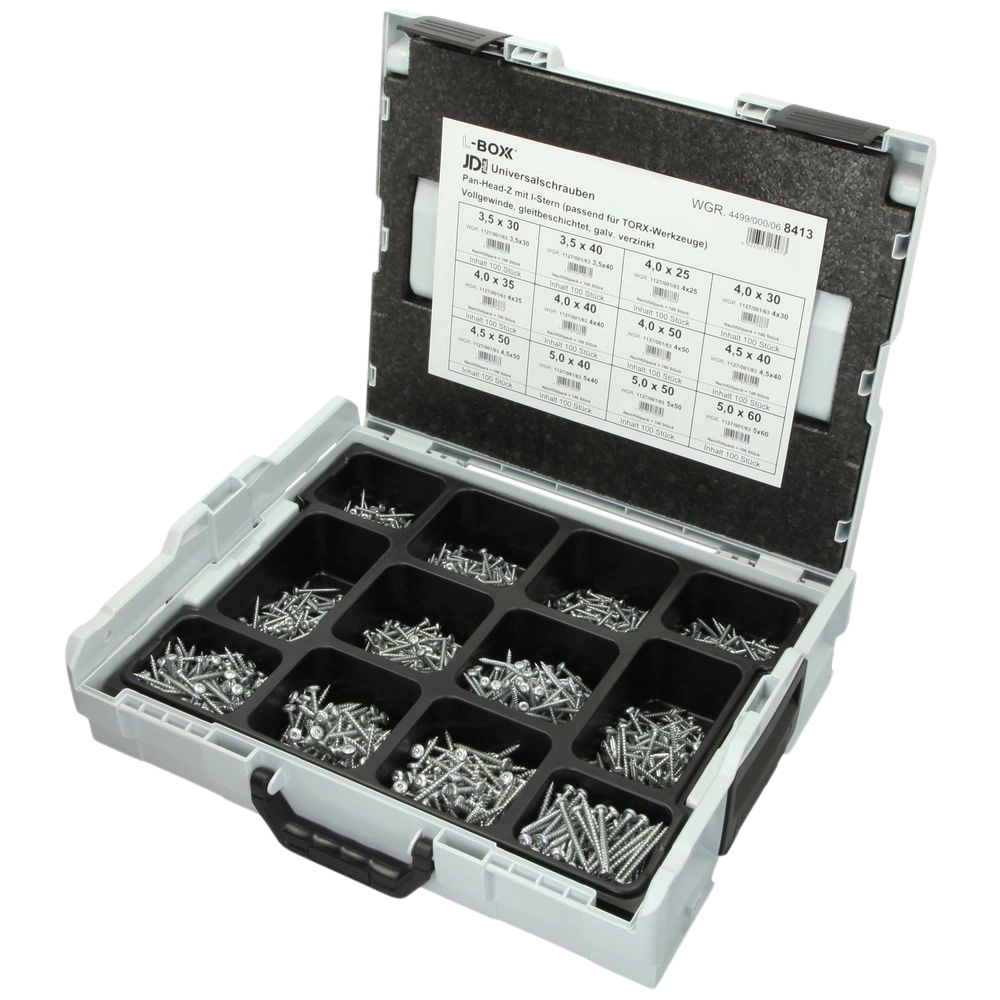 De robuuste Sortimo L-BOXX® is 12 keer uitgerust met 1200 JD-Plus universele schroeven en een gelamineerd montageplan. De schroeven hebben een kop Z