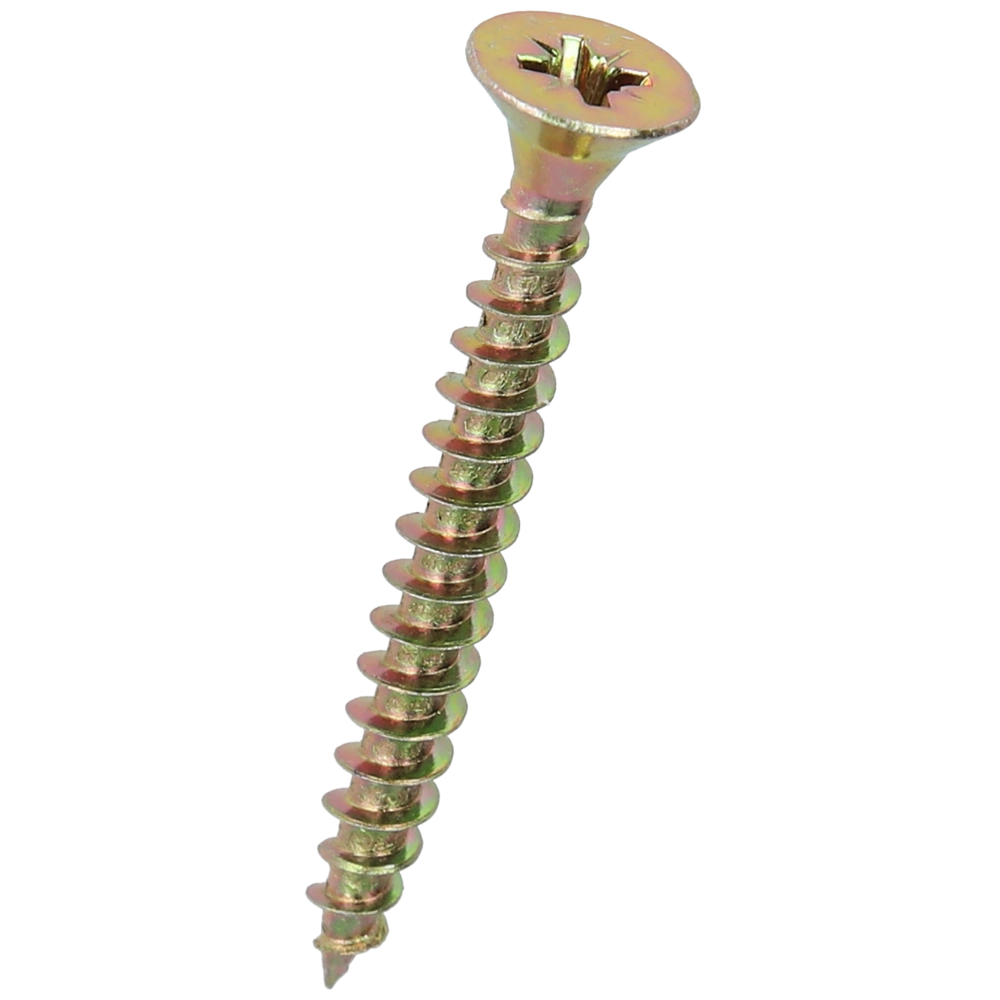 Verzinkte en geel verchroomde schroef met verzonken kop en schroefdraad voor universeel gebruik in hardhout, spaanplaat en kunststof.