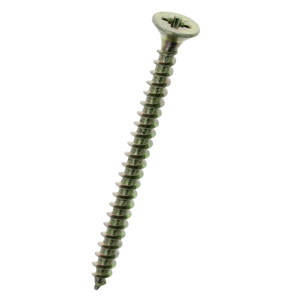 Verzinkte en geel verchroomde schroef met verzonken kop en schroefdraad voor universeel gebruik in hardhout, spaanplaat en kunststof.