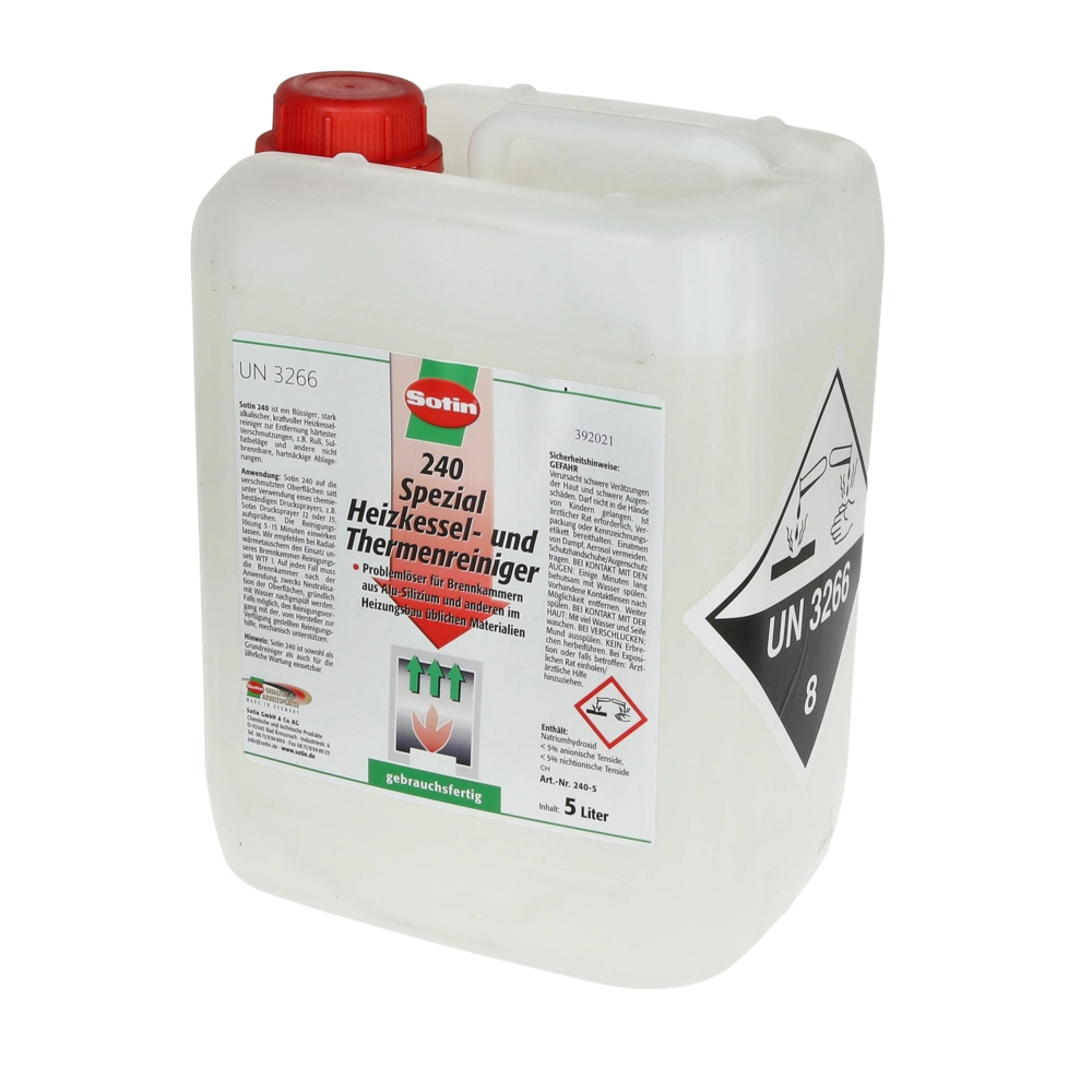 Ketelreiniger voor olie- en gasgestookte warmtegeneratoren, condensatieketels, warmtewisselaars en geisers van aluminium en silicium evenals gasgestookte stalen ketels. De sterk alkalische, gebruiksklare oplossing voor sproeien of dompelen verwijdert de hardnekkigste vervuilingen zoals roet, sulfaatafzettingen en andere niet-brandbare afzettingen. Te gebruiken als basisreiniger en voor jaarlijks onderhoud.