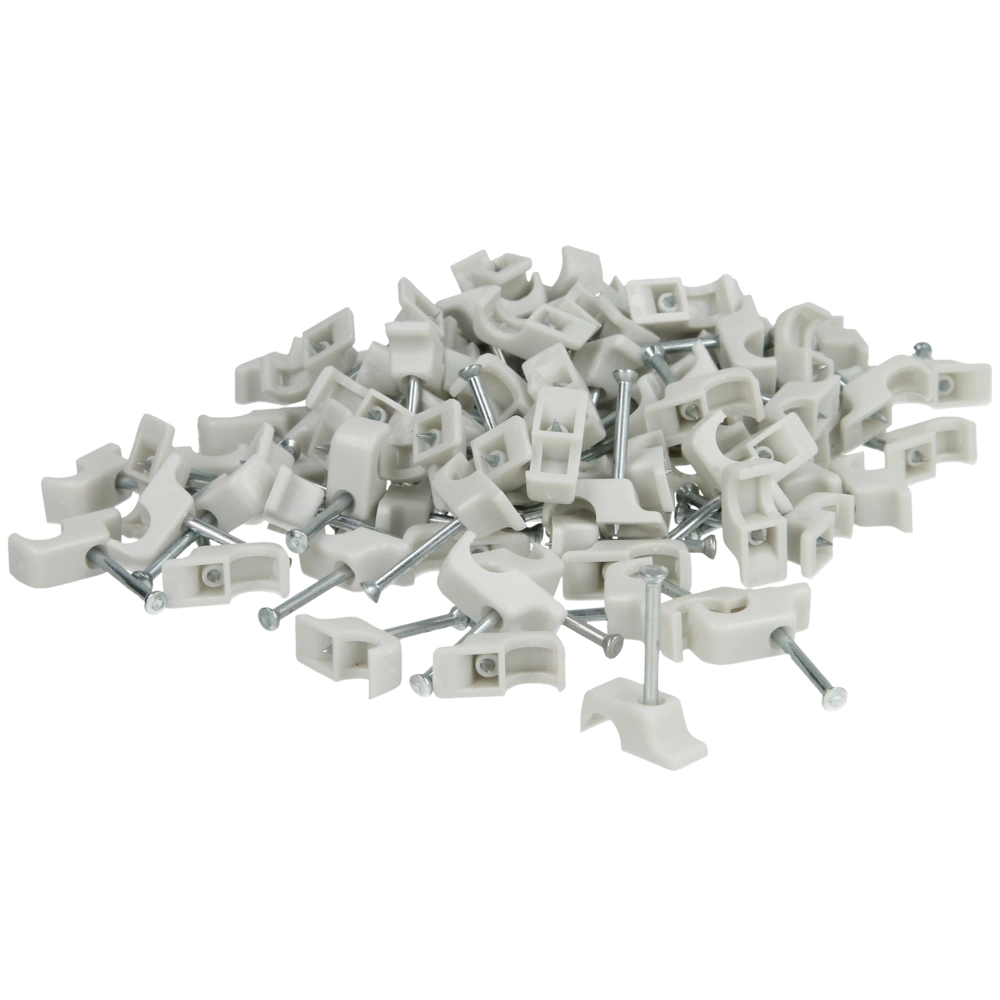 Spijkerclips met stalen spijker voor het bevestigen van kabels aan muren, plafonds en balken.