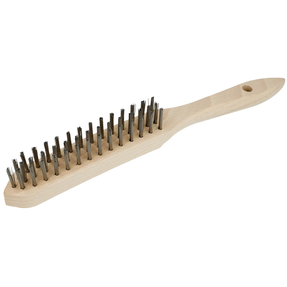 Staalborstel met houten handvat en staaldraadharen voor ontroesten, ontlakken en reinigen.