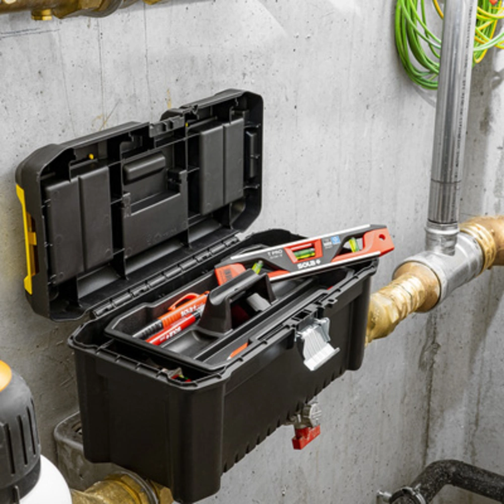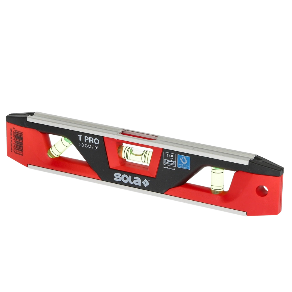 Compacte, handzame waterpas in conische vorm van aluminium met ABS-kunststof afdekking voor nauwkeurige horizontale en verticale uitlijning, evenals voor hellingen en hoeken. De extreem robuuste weegschaal is uitgerust met drie extra grote, breukvaste buisniveaus van acrylglas, waardoor comfortabel en nauwkeurig aflezen in alle posities mogelijk is. Daarnaast beschikt hij over een horizontale waterpas met 4 ring-libellen voor de hellingsweergave van 2% metingen. De sterke, diepe magneetstrip zorgt voor een veilige hechting op metalen oppervlakken. De V-groef maakt het gemakkelijker om buizen en kabels uit te lijnen.