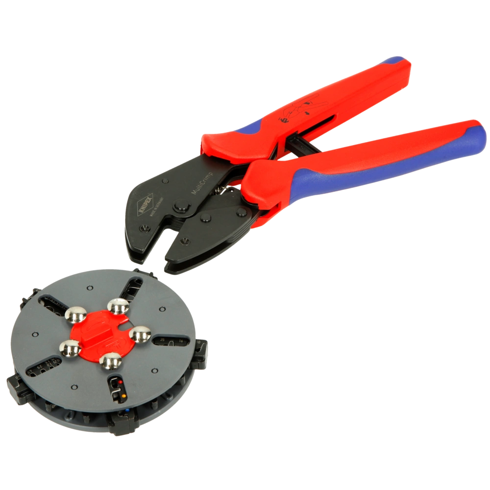 Het roterende magazijn bewaart de krimpmatrijzen veilig, waardoor ze snel en eenvoudig te verwisselen zijn zonder extra gereedschap. Deze veelzijdige tang, gemaakt van chroom-vanadiumstaal, is krachtig en duurzaam. De precisiematrijzen garanderen een consistent hoge krimpkwaliteit. Het fijn instelbare, ontgrendelbare vergrendelingsmechanisme ontgrendelt automatisch bij de optimale krimpdruk.