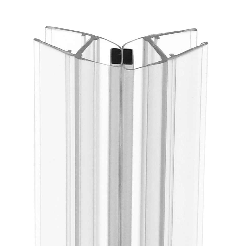 Transparante afdichting met magnetische sluitstrip voor zijdelingse montage op douchedeuren die elkaar raken onder een hoek van 135°. Het waterafstotende profiel kan op maat worden gesneden, hecht...