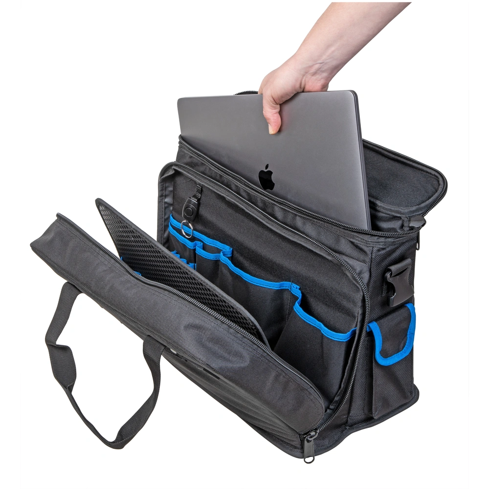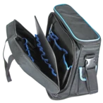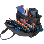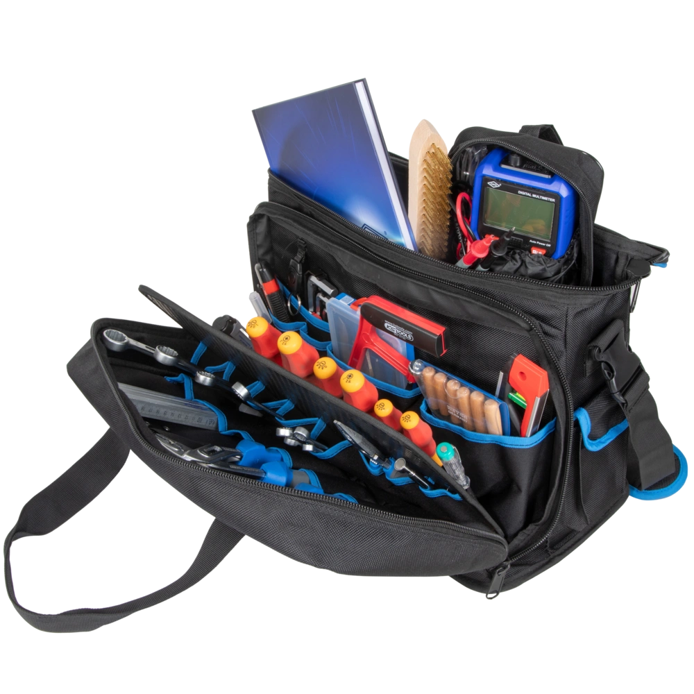 Gereedschapsset voor elektrotechniek en metaalbewerking. De stevige nylon tas heeft lussen en inzetstukken om het handgereedschap overzichtelijk te organiseren. Gevoelige meetapparatuur en een laptop...